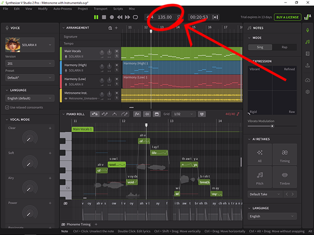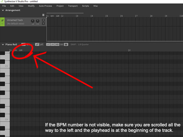 Synthesizer V Studio 1: Double click the small number '120' at the start of your track, located just above the piano, below the selection options.